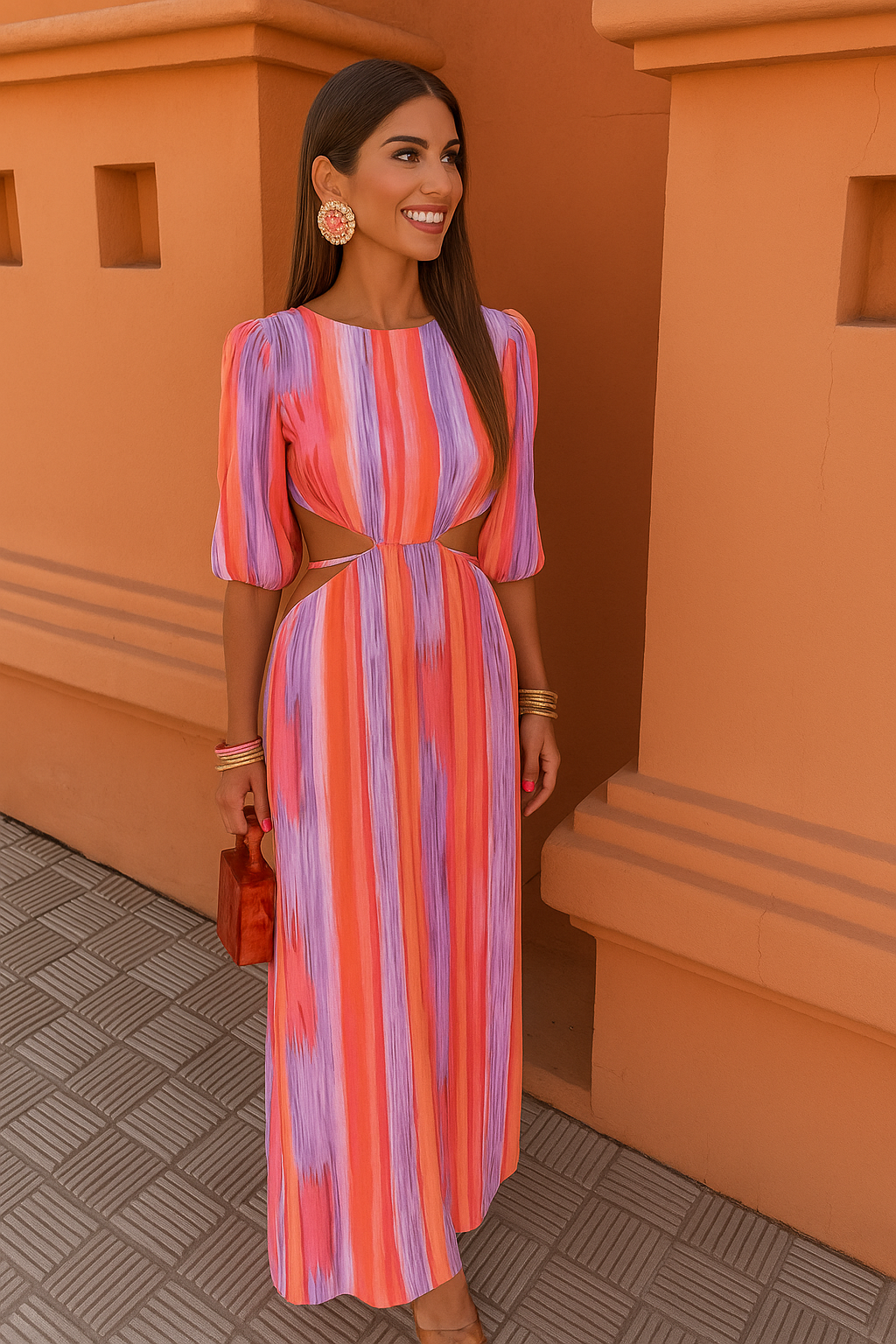 Denna eleganta klänning har trekvartsärmar, en lång, flytande kjol och sofistikerade utskärningar vid midjan. Det vertikala mönstret förlänger silhuetten, medan den figurnära överdelen och den breda urringningen ger en vacker balans mellan struktur och lätthet.
