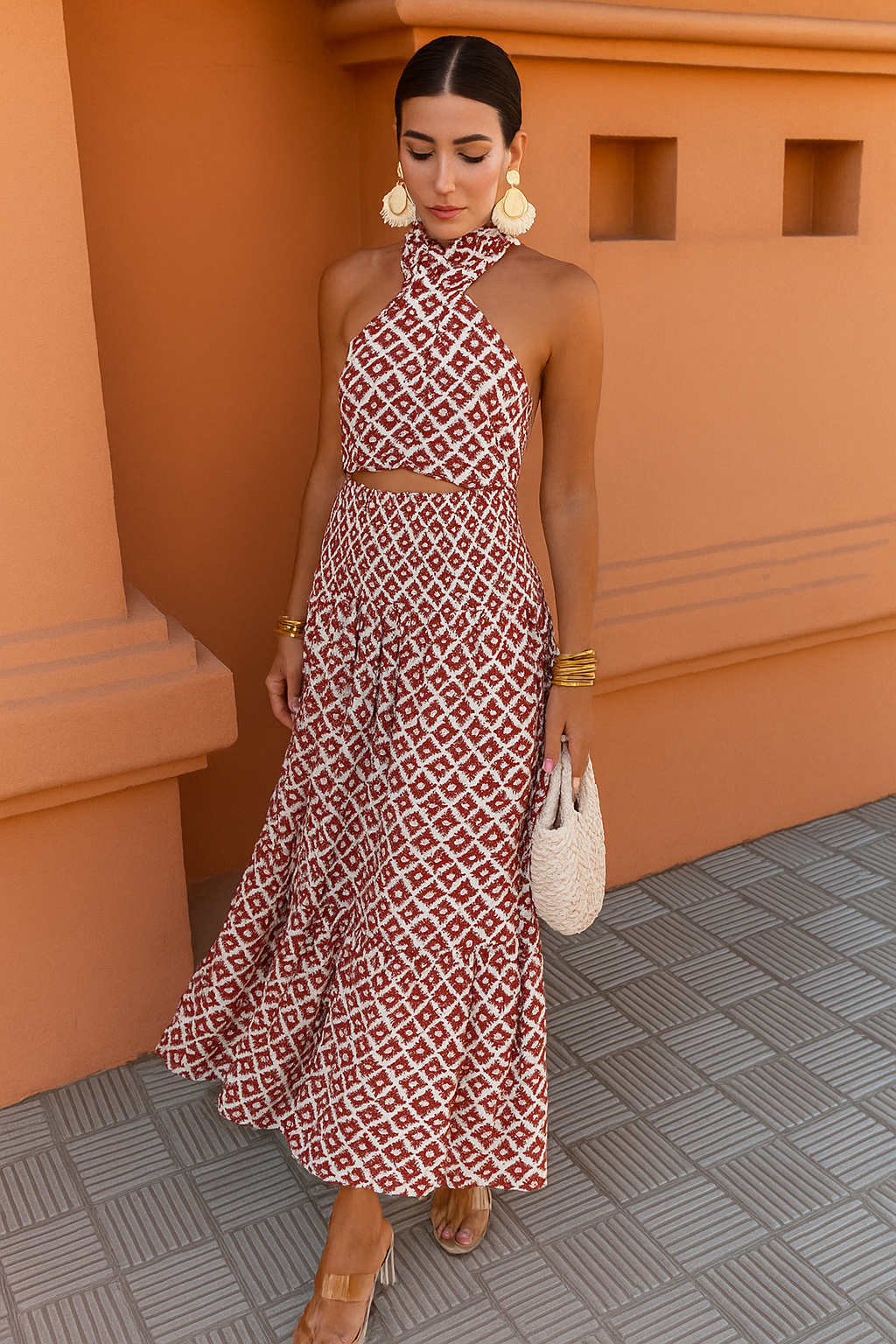 Denna ärmlösa maxiklänning har en halterneck-ringning med öppen rygg och en mjukt fallande kjol. Den markerade midjan och det geometriska mönstret skapar en fräsch men sofistikerad look – perfekt för semester och avslappnade sommarstunder.